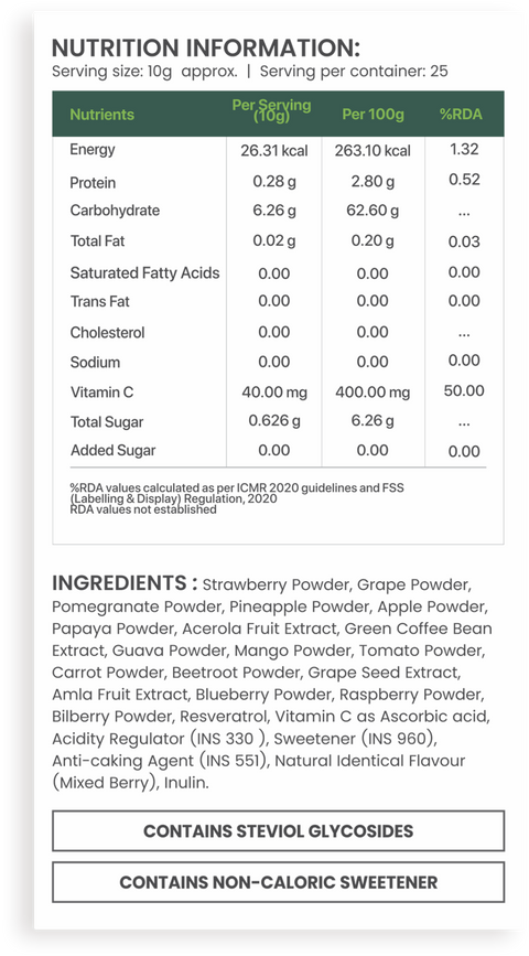 The high levels of Vitamin C and antioxidants help protect skin from UV damage, reduce signs of aging, and promote collagen production, keeping the skin firm and youthful.